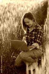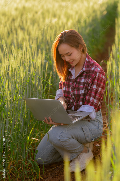 Asian agricultural woman holds laptop to check barley quality before harvesting