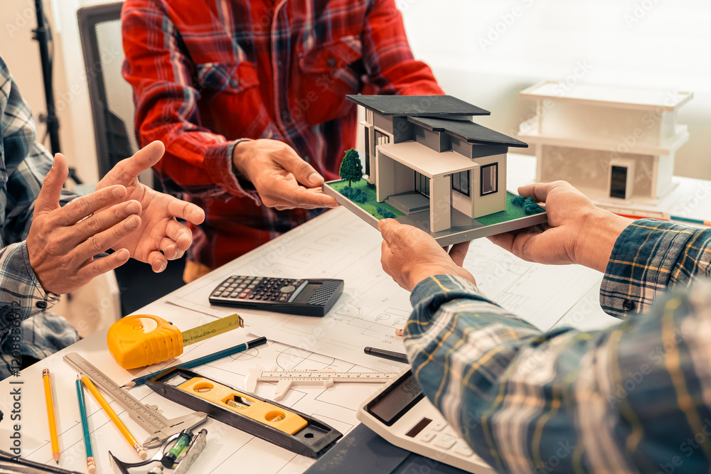 Multiethnic group of male and female architects and builders standing around an office table looking at paper blueprint plans and house plans on the table. Close-up photo