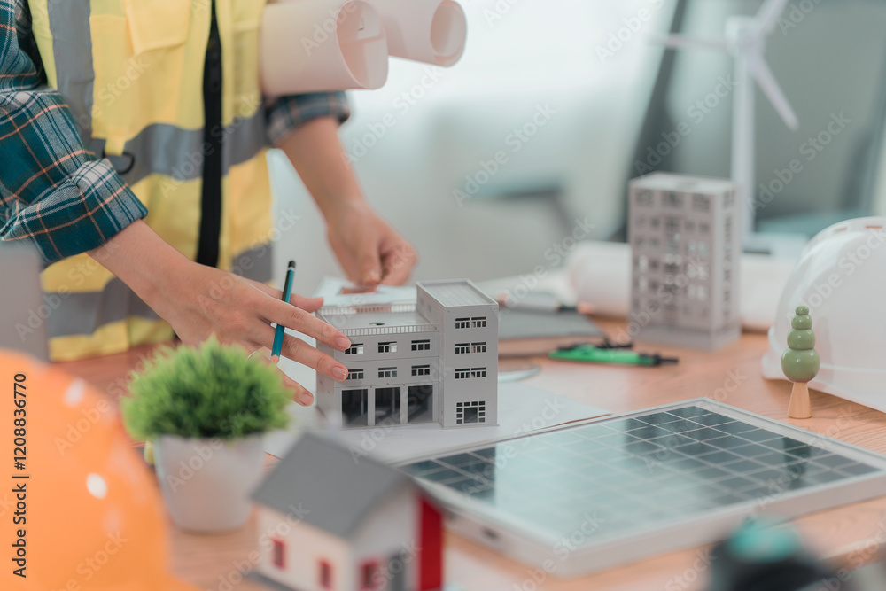 Multiethnic group of male and female architects and builders standing around an office table looking at paper blueprint plans and house plans on the table. Close-up photo