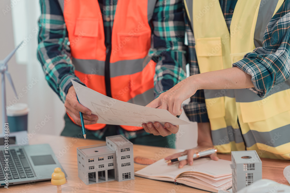Multiethnic group of male and female architects and builders standing around an office table looking at paper blueprint plans and house plans on the table. Close-up photo