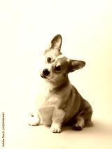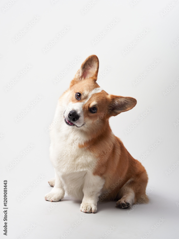 A Corgi tilts its head while sitting in a studio with a white background. The playful expression and bright lighting emphasize the dog's cheerful personality.