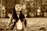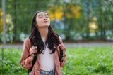 University student wearing backpack is breathing fresh air, enjoying a moment of peace and tranquility in the green campus park during a break from studying