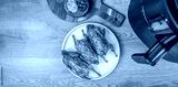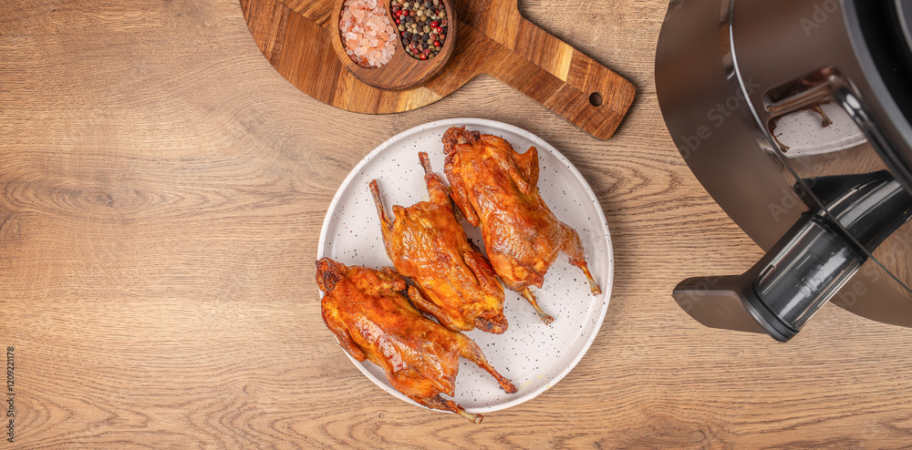 roasted quails with from the hot air fryer oven on a wooden background. top view. copy space