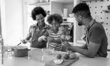 Happy african american parents and child having fun preparing healthy food in kitchen