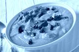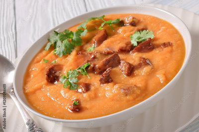 creamy carrot beef soup in a white bowl
