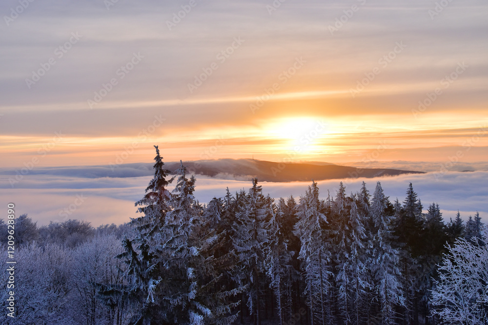 Winter landscape sunset sky in mountains of White Carpathians, Czechia
