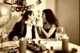 Lesbian couple sharing strawberry during romantic valentine's day dinner