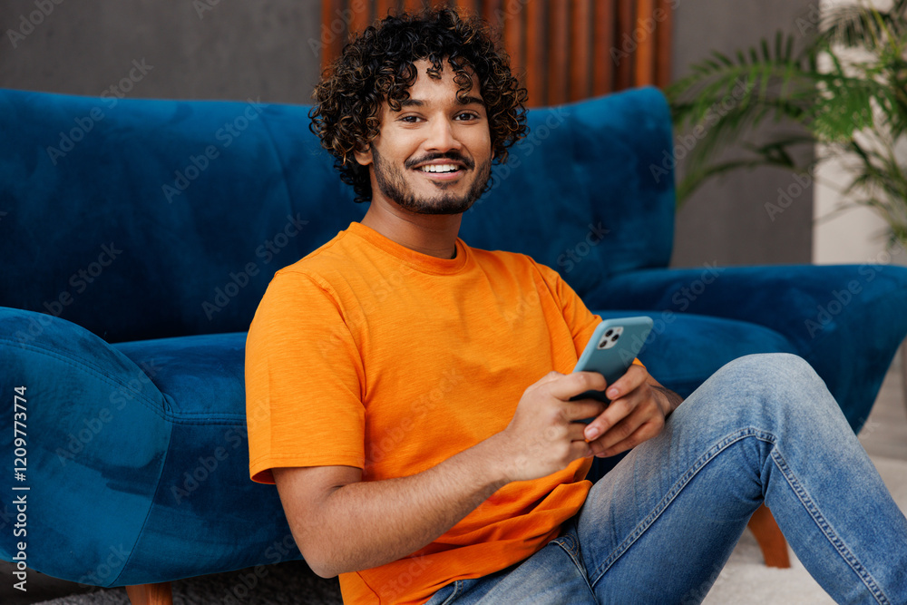 Young smiling Indian man wear orange casual clothes sit near blue sofa couch hold use mobile cell phone stay at home hotel flat rest relax spend free spare time in living room indoor. Lounge concept.