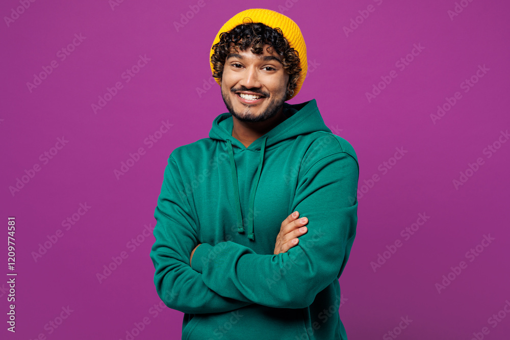 Young smiling cheerful happy Indian man he wear green hoody yellow hat casual clothes hold hands crossed folded looking camera isolated on plain purple background studio portrait. Lifestyle concept.