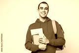 Young smiling happy smart middle eastern man boy student he wear red casual clothes backpack bag hold books look camera isolated on plain solid white background High school university college concept
