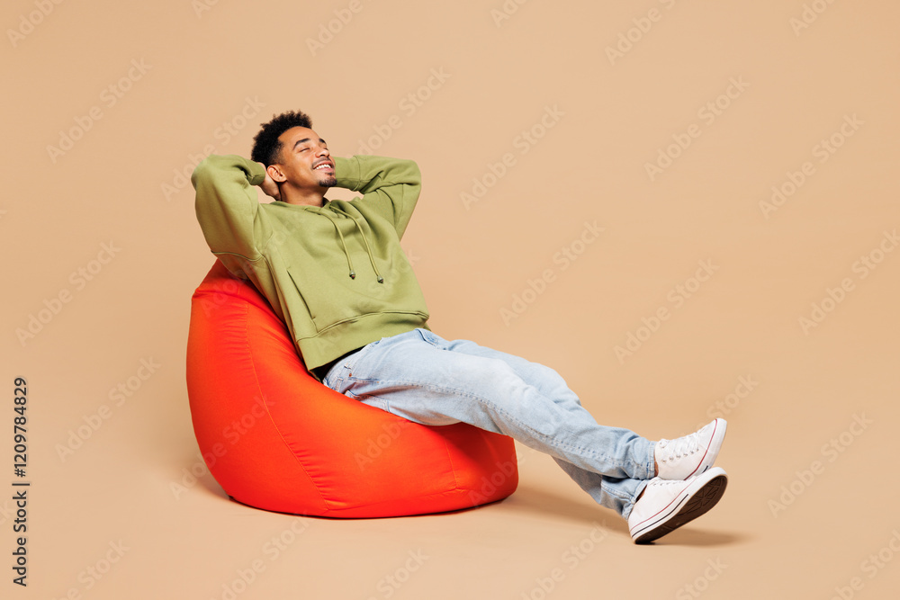 Full body young man of African American ethnicity he wears green hoodie casual clothes sit in bag chair hold hands behind neck close eyes isolated on plain pastel beige background. Lifestyle concept.