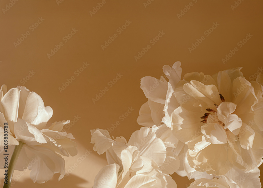 Soft and dreamy beige flower textured background, white tulips. copy space