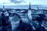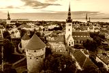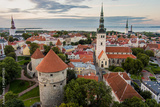 Iconic aerial skyline view of Tallinn Old Town on a sunny summer morning. St. Olaf's, St. Michael's churches, Alexander Nevsky Cathedral, defensive walls, rooftops.