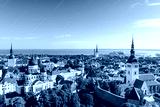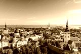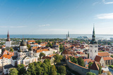 Iconic aerial skyline view of Tallinn Old Town on a sunny summer morning. St. Olaf's, St. Michael's churches, Alexander Nevsky Cathedral, defensive walls, rooftops.