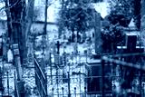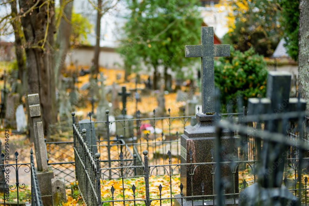 Yellow autumn leaves covering gravestones of Bernardine cemetery, one of the three oldest graveyards in Vilnius, Lithuania.