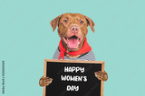 Happy Women's Day. Lovable brown dog and congratulatory inscription. Closeup, indoors, studio shot. Congratulations for family, loved ones, relatives, friends and colleagues. Pet care concept