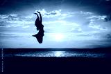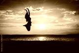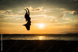 Successful woman jumping, dancing and having fun on sunset in beach. Freedom and happiness concept. Girl celebrating work out success.