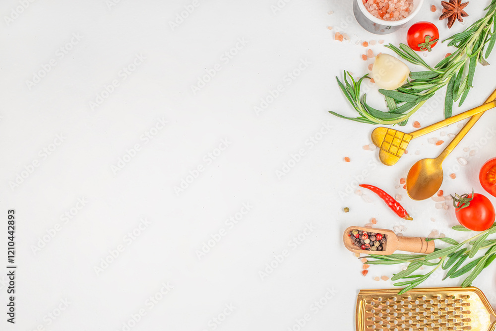 Flat lay composition with ingredients for cooking spices and herbs on white background, copy space