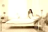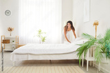 Cheerful woman is making bed in the early morning as part of daily routine. She is at home in the bedroom, starting a new day with a positive attitude, preparing for the day ahead.
