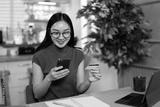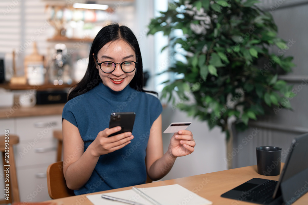 Happy optimistic young girl holding credit card and using laptop computer shopping online at home.