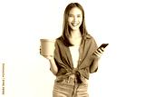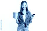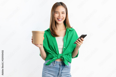 Smiling beautiful Asian woman holding cardboard boxes and hands using smartphone on white background. Concept delivery online.