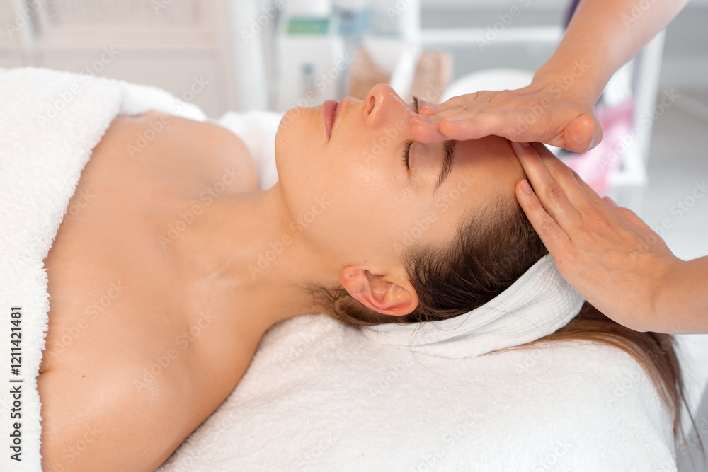 Crop massage therapist providing massage on woman's forehead at cosmetology clinic. Relaxed female client is getting pampered in spa by professional beautician