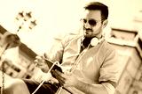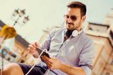 Portrait of young man in the city / Young man siting on the banch somewhere in the city and looking at smartphone