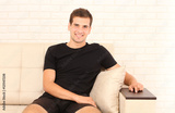 Smart handsome guy sitting on the sofa. Copy space and selective focus