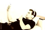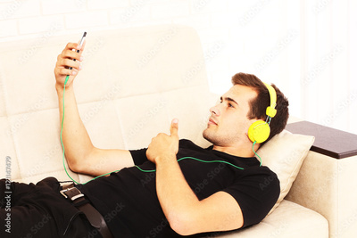 Young guy is lying on the bed, listening to music and making selfie on his phone.