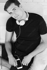 Handsome man sitting on the sofa with headphones and mobile phone