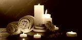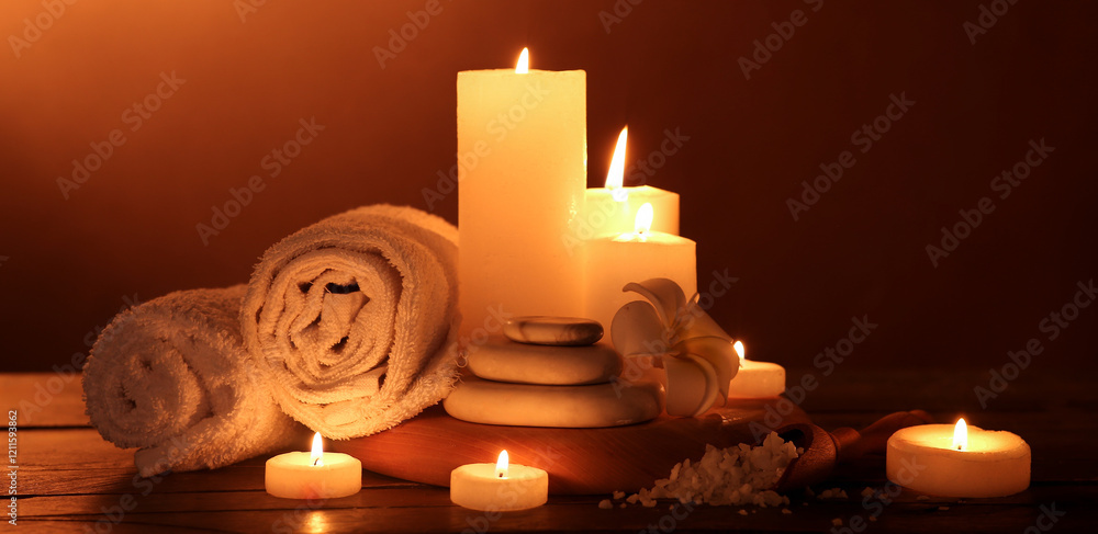 Burning candles with towels, plumeria flower, sea salt and spa stones on wooden table against dark background