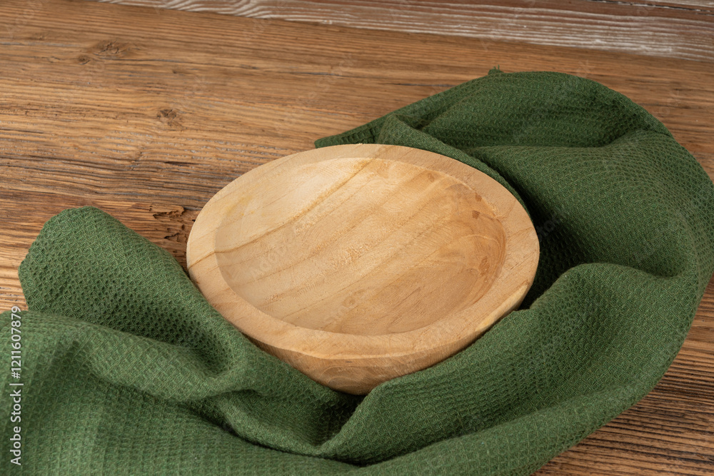 Empty wood bowl on table, plate on wooden table and tablecloth, light rustic dish mockup