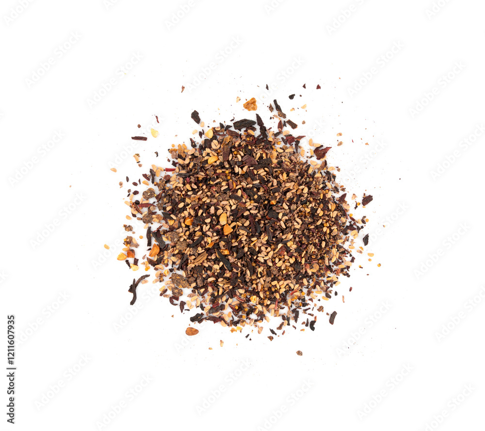 Dry black tea with hibiscus, fruits isolated. Raspberry seeds red tea, karkade flower leaves