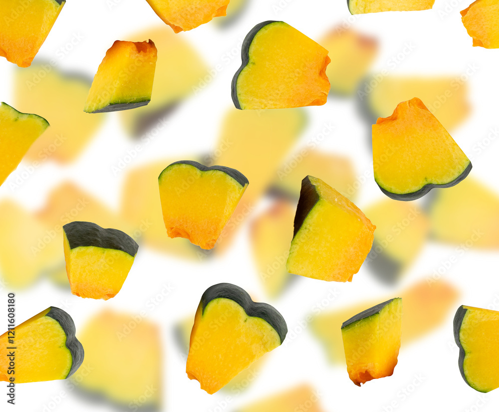 Falling Pumpkin piece isolated, sweet kabocha squash cut, flying sliced acorn pumpkin on white