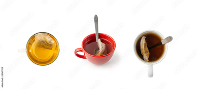 Herbal tea sachet in cup, hot water with chamomile and Hypericum or St. John's wort teabag