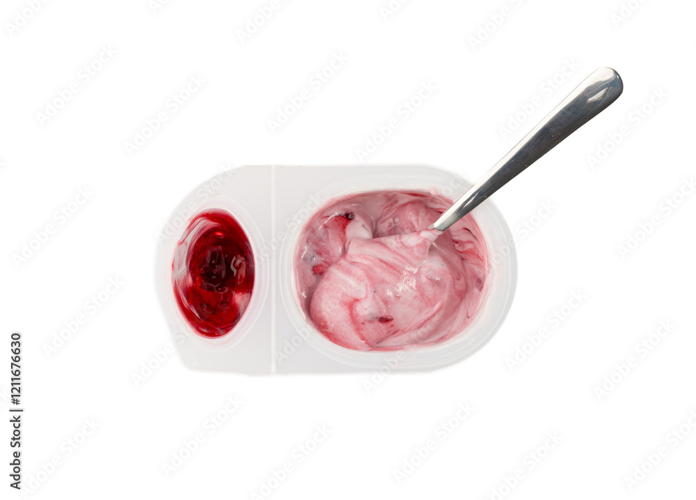 Yogurt cup isolated, white yoghurt with cherry jam in plastic pot, milk pudding container