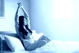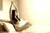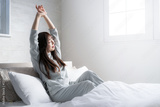 ベッドの上で寝起きで伸びやストレッチをする女性