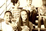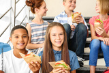Schoolchildren eating sandwiches while sitting on stair-steps at school