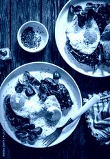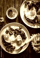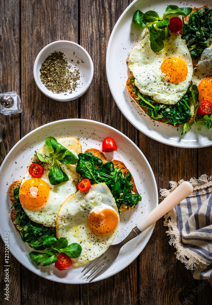 Crispy toast with stewed spinach and fried eggs with runny yolks on wooden table