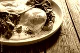 Crispy toast with stewed spinach and fried eggs with runny yolks on wooden table