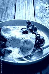 Crispy toast with stewed spinach and fried eggs with runny yolks on wooden table