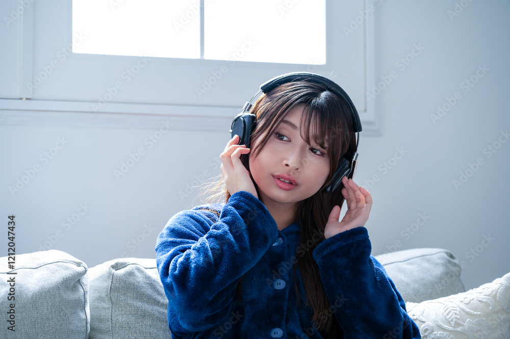 ヘッドホンで音楽を聴く日本人女性
