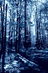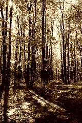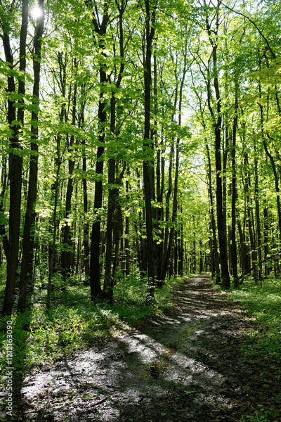 trees with young bright green foliage in spring forest, beautiful nature background. Spring landscape with pathway in sunny day.