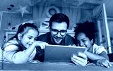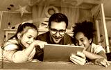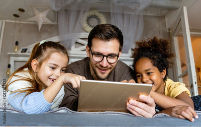Young single father, smiling daughters playing on digital tablet at home. Family technology concept