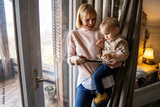 Relax, home. Son with mother using tablet for elearning, playing games, watching video on website.