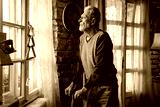 Upset thoughtful retired single man at home or nursing home alone with crutch , feels abandoned,