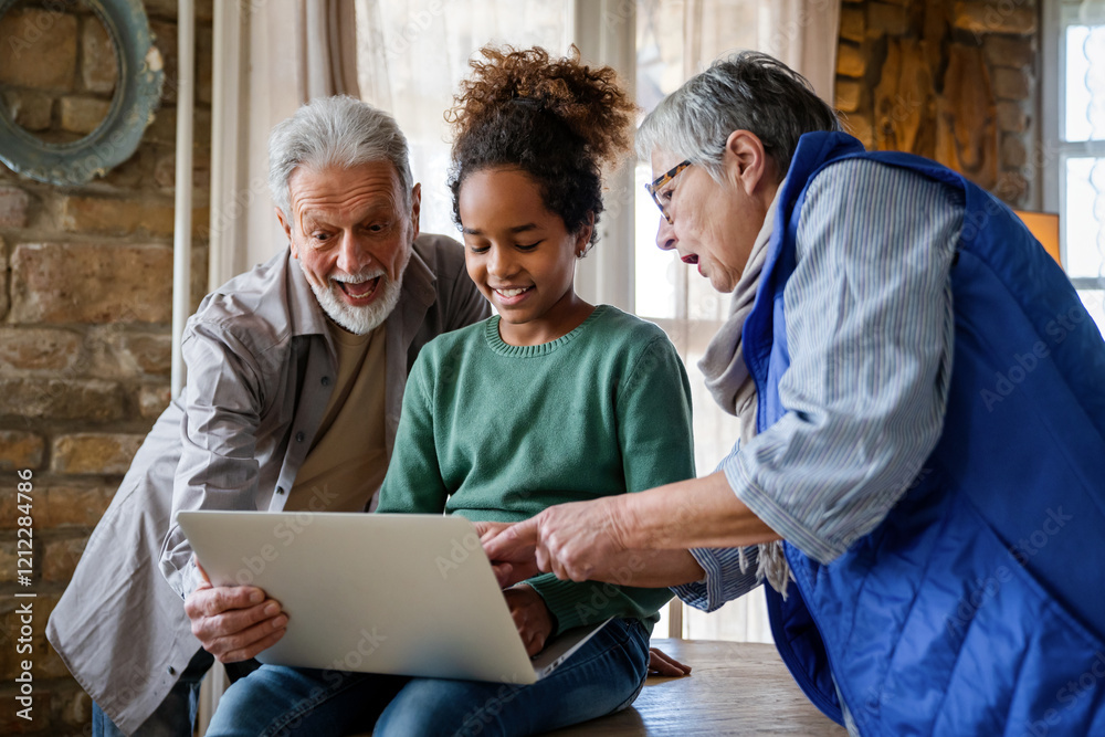 Mature couple with grandchild look at laptop screen and learn how to make video call or use laptop