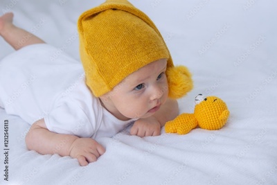 A child walks with a little teddy bear and gets ready for bed.