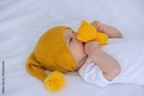 A child walks with a little teddy bear and gets ready for bed.