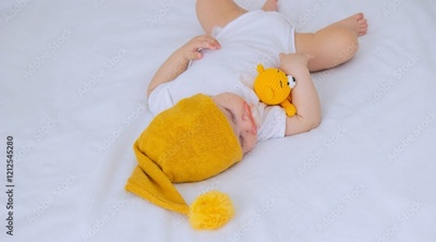 A child in a white bodysuit is sleeping on a white background, hugging a small yellow teddy bear